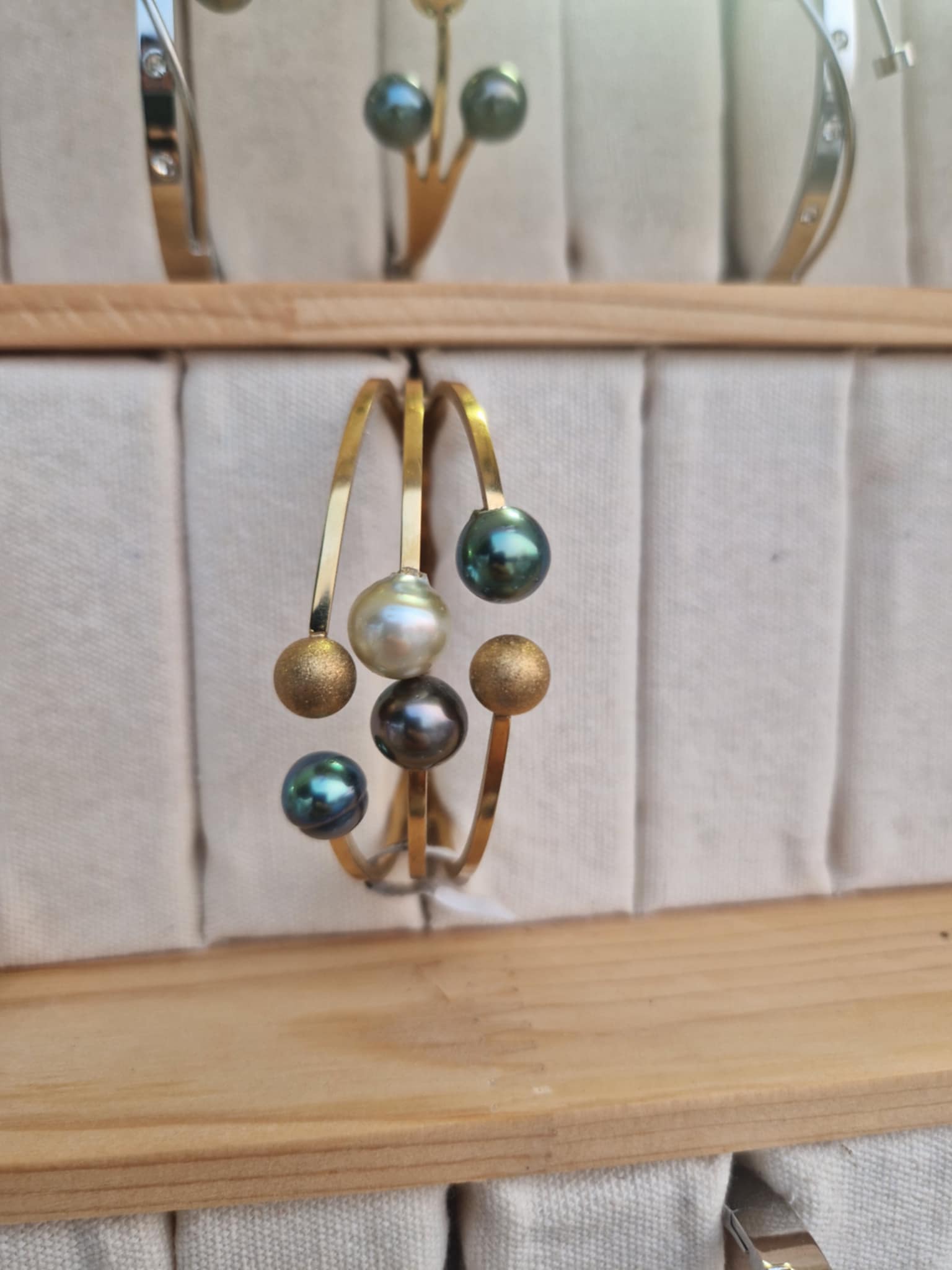 Bracelet en acier inoxydable avec dorure 18 carats et perles de Tahiti semi ronde qualité B multicolores. quantité 2 bracelets. frais de port chronopost inclu