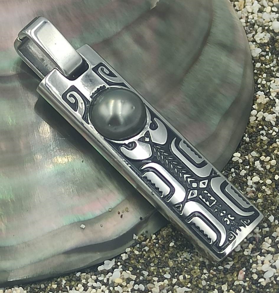 Un très jolie médaillon en acier inoxydable avec une incrustation de perle de Tahiti. Motif Feti’i gravé dans le métal. Le motif feti’i qui signifie la famille symbolise le lien générationnel entre parents et enfants, la perle symbolisant l’être chère. Le médaillon est fourni avec un rond de cuir 3mm de diamètre noire , 45cm de longueur avec un fermoir incluant une extension de 5cm toujours en acier inoxydable.