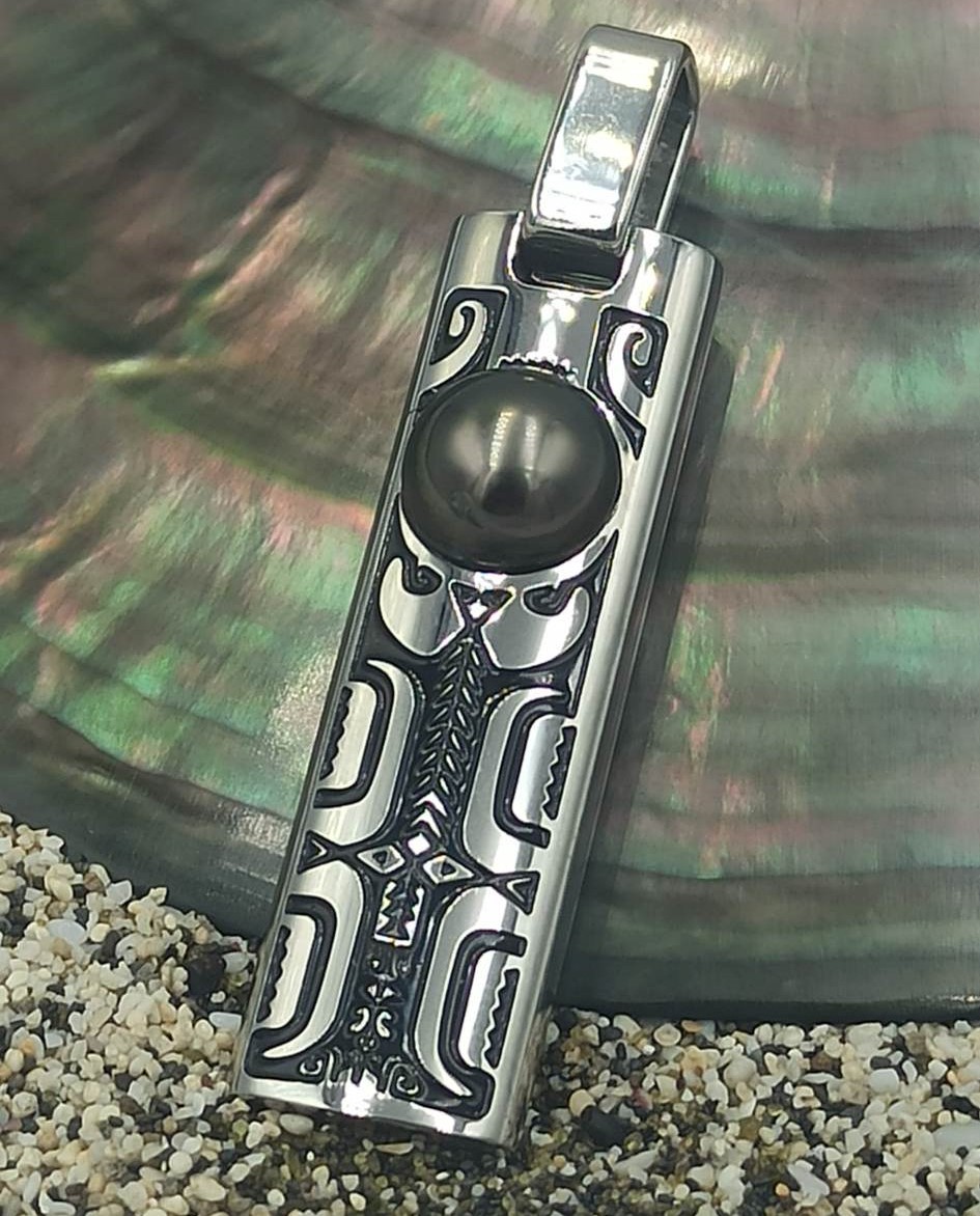 Un très jolie médaillon en acier inoxydable avec une incrustation de perle de Tahiti. Motif Feti’i gravé dans le métal. Le motif feti’i qui signifie la famille symbolise le lien générationnel entre parents et enfants, la perle symbolisant l’être chère. Le médaillon est fourni avec un rond de cuir 3mm de diamètre noire , 45cm de longueur avec un fermoir incluant une extension de 5cm toujours en acier inoxydable.