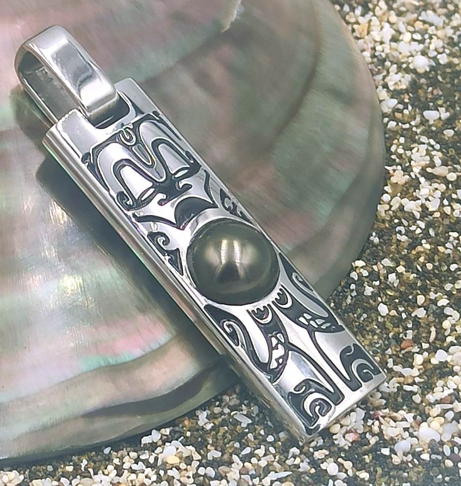 Un très joli médaillon en acier inoxydable avec une incrustation de perle de Tahiti. Motif TIKI gravé dans le métal. Le tiki symbolise la protection, la perle au centre symbolisant l’être chère. Le médaillon est fourni avec un rond de cuir 3mm de diamètre noire , 45cm de longueur avec un fermoir incluant une extension de 5cm toujours en acier inoxydable.
