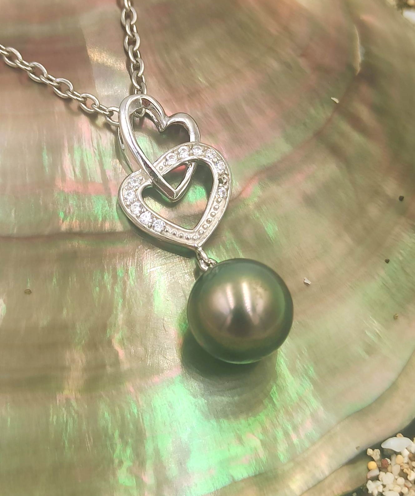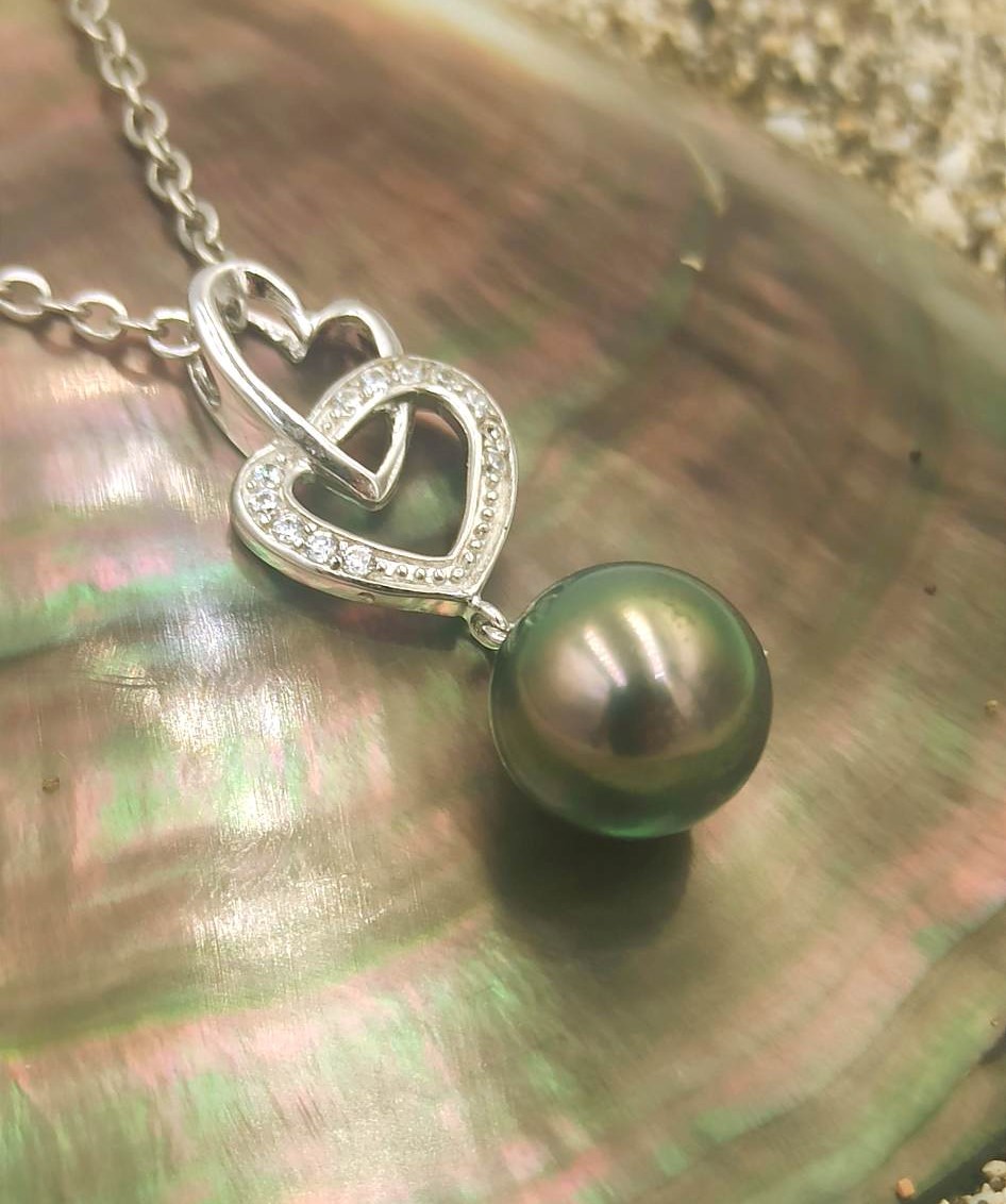 Ce pendentif représente deux cœurs entrelacés qui soutiennent une perle de Tahiti.