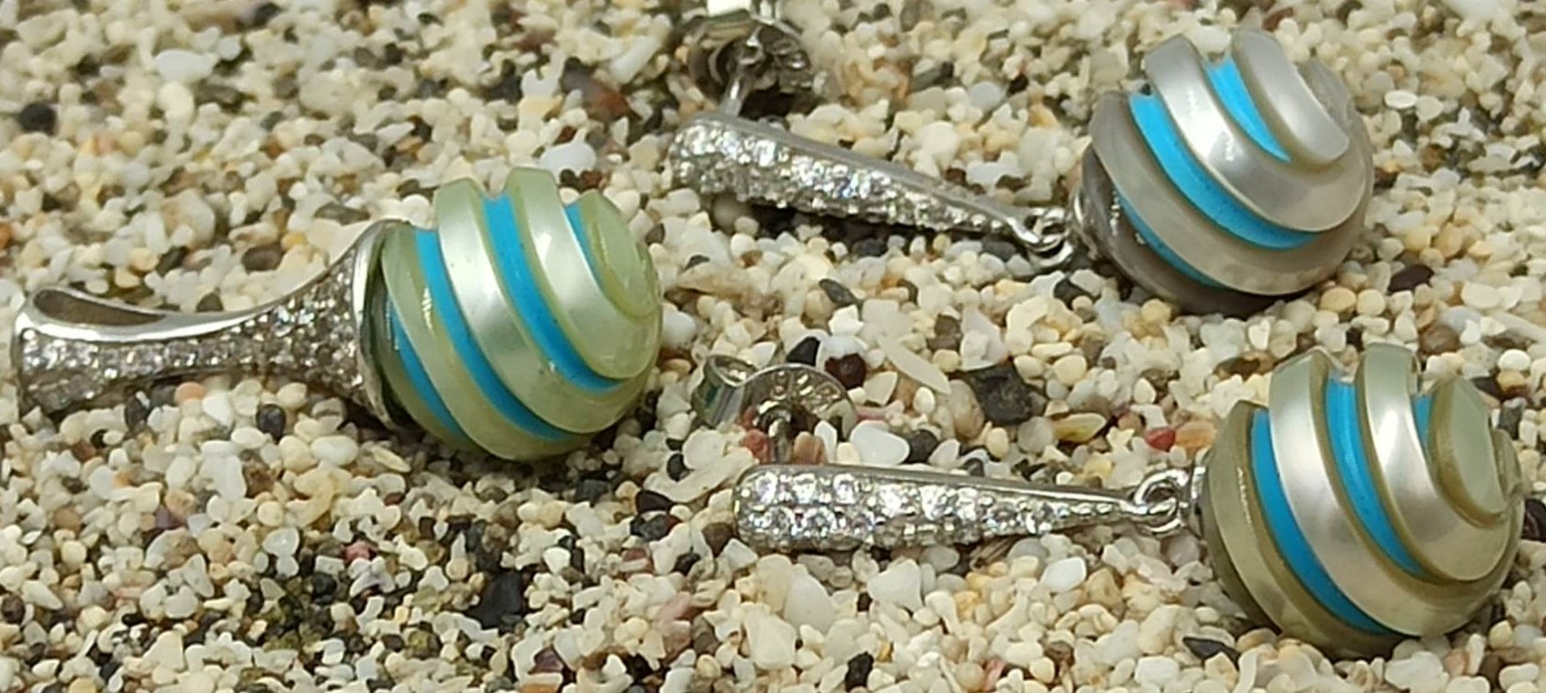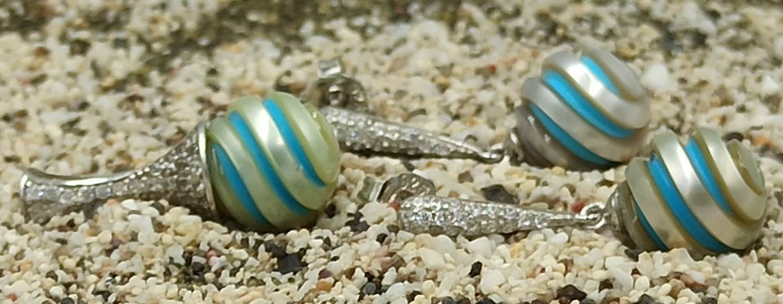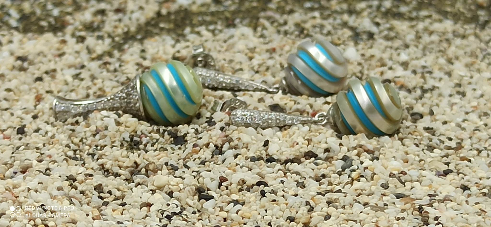 Les perles Galatea sont des perles semi précieuse greffée avec des turquoises. C’est pourquoi lorsqu’on les grave la belle couleur bleue ressort. Cette parure fera donc son effet car il est très rare d’en trouver en France.