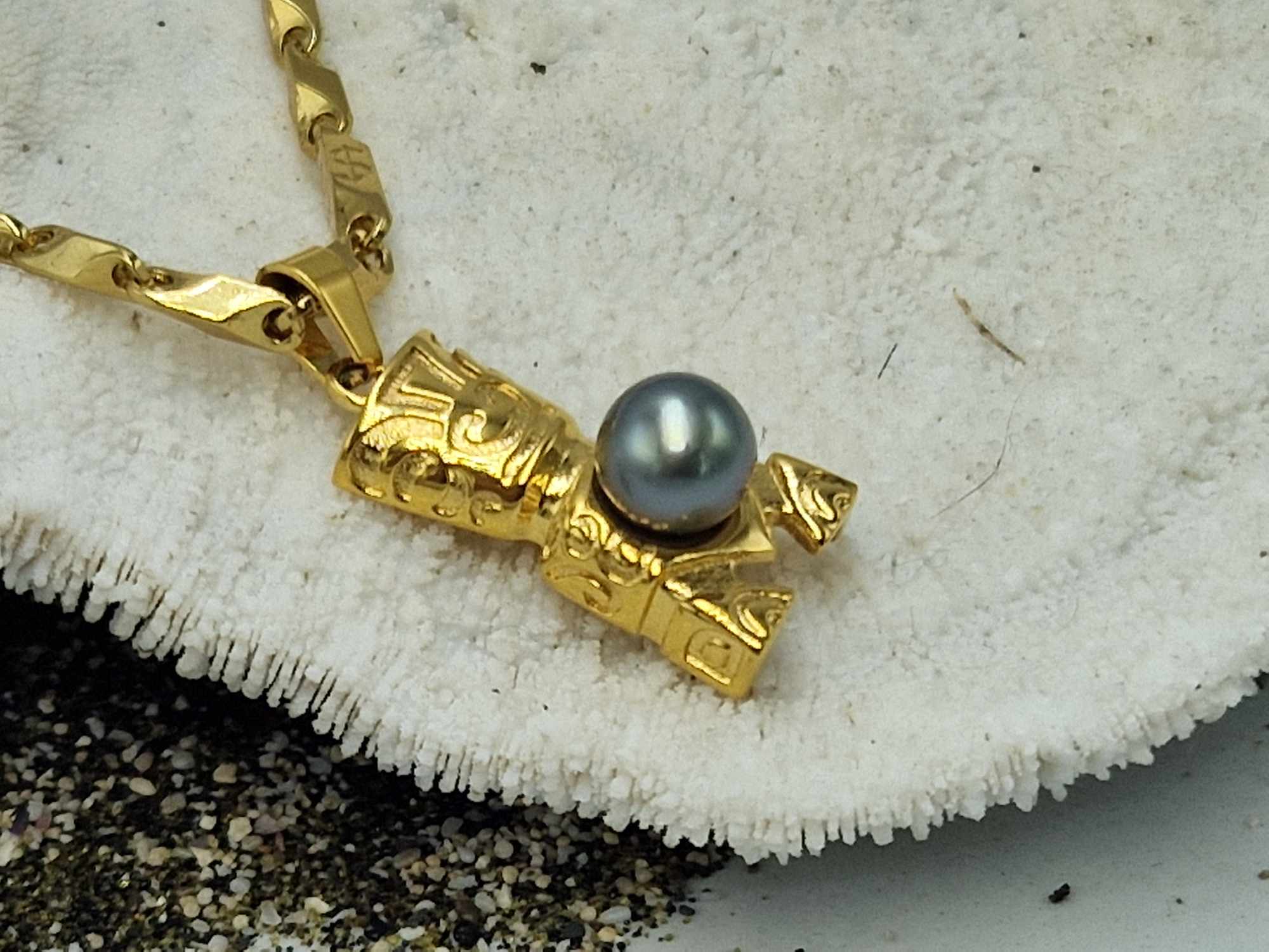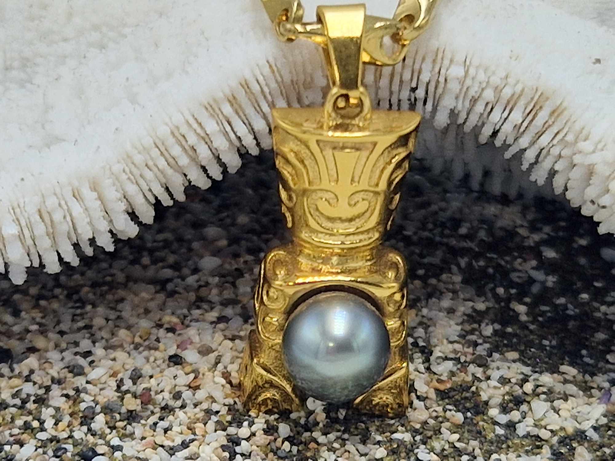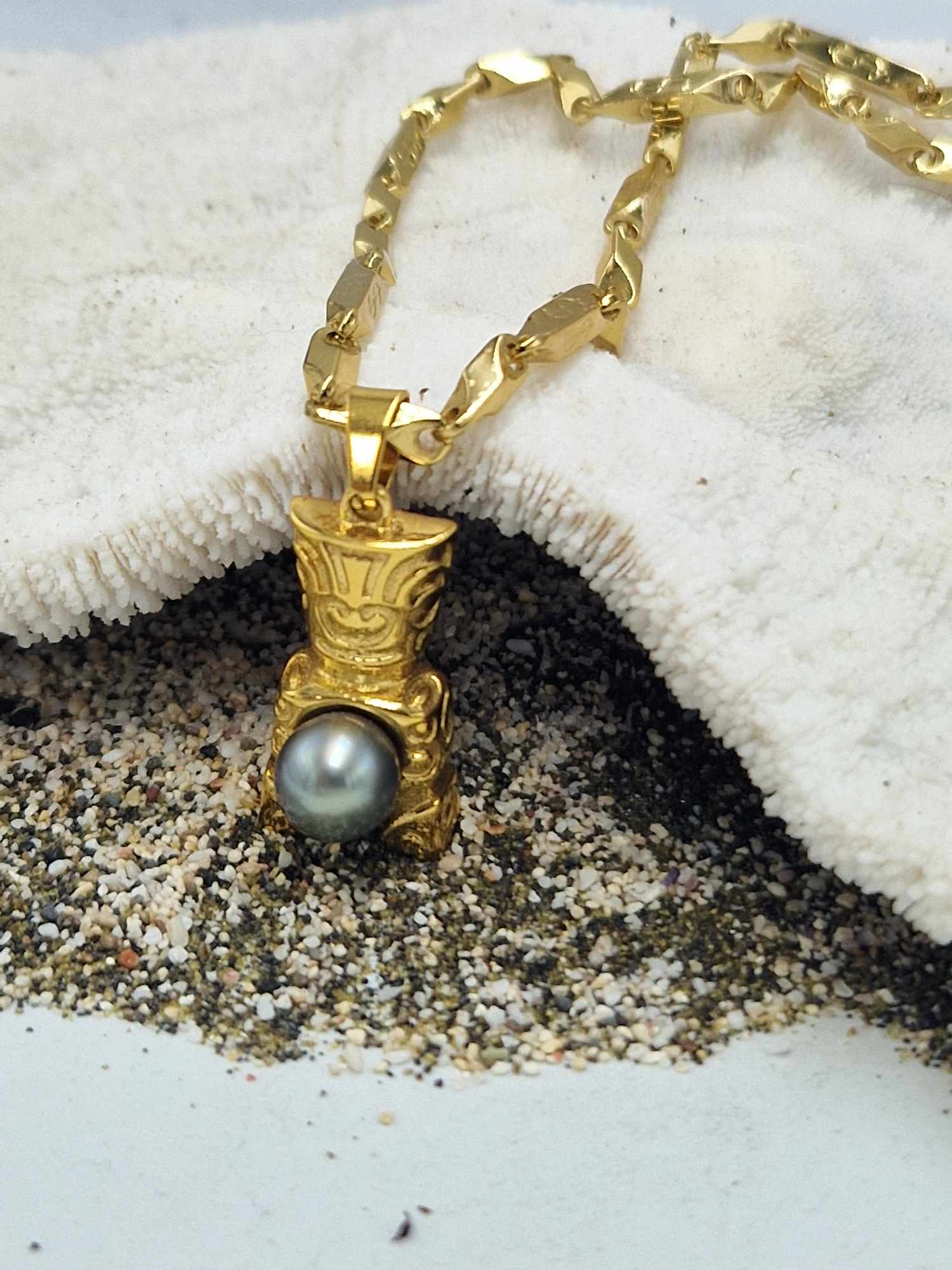 Très jolie tiki en acier inoxydable doré avec une splendide perle de culture de Tahiti, ronde de qualité A 9mm de diamètre.Livré avec chaîne 50 cm également en acier inoxydable.